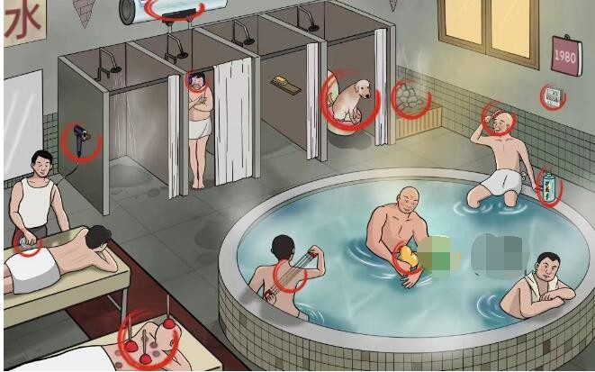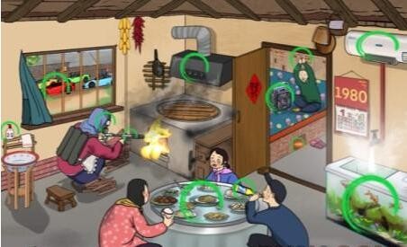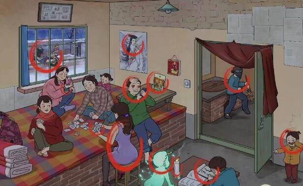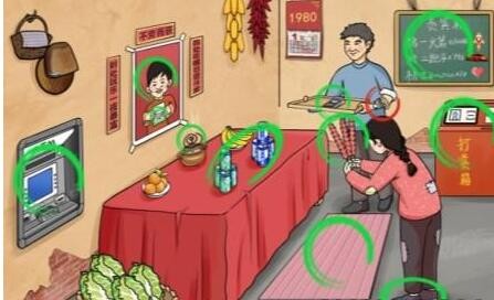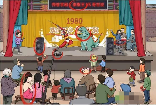 文字玩出花怀旧岁月32十二处不合理是:atm机、马财神、蚊香、假货、瑜伽垫、淀粉肠、pose机、打赏箱、贵宾榜、假鞋、二维码、手表。