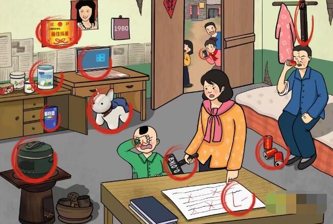 文字玩出花怀旧岁月33十二处不合理是:电饭煲、负分试卷、玩具锤、毛绒玩具、智能手表、去火凉茶、八匹狼、笔记本、奖状、奶粉、手机、脑铂金。