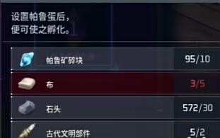 2、帕鲁蛋孵化器需要玩家收集10个帕鲁矿碎块、5块布、30个石头、以及两个古代文明部件来进行建造。
