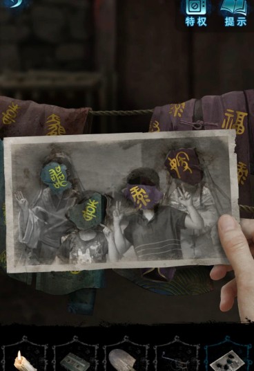 2、图片上有四个小洞,玩家将图片比在寿衣上,刚好圈起来四个字;