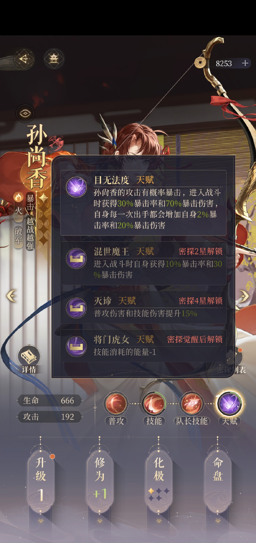 孙尚香的攻击有概率暴击,进大战斗时获得30%暴击率和70%暴击伤害,自身每一次出手都会增加自身2%暴击率和20%暴击伤害。