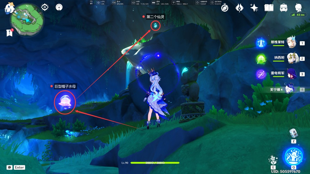 5、将第一个仙灵归位后,我们转身,利用【巨型帽子水母】飞到第二个仙灵处。之后跟随着第二个仙灵走,将其归位即可。