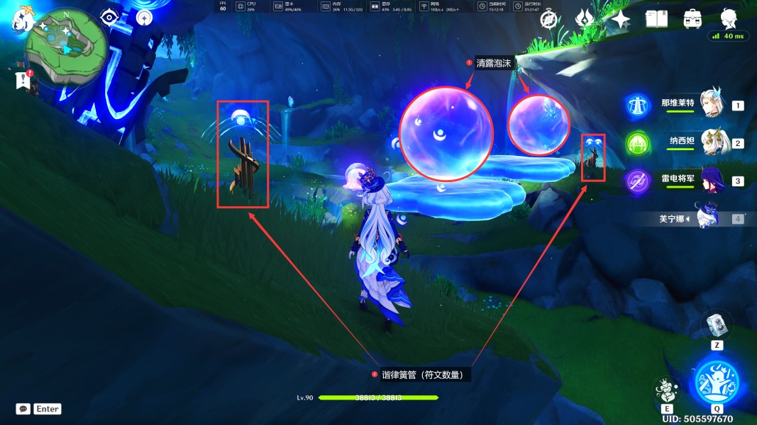 7、激活此处的水元素方碑后,中间会出现两个平台以及两个【清露泡沫】,我们按照【谐律簧管】上方的【符文数量】。