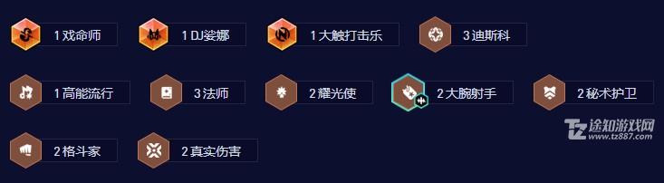 1戏命师、1DJ娑娜、1大触打击乐、3迪斯科、1高能流行、3法师、2耀光使、2大腕射手、2秘术护卫、2格斗家、2真实伤害