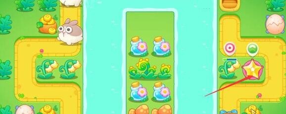 5、在如图所示位置放置一个毒针塔,在图中央放置两个星星塔,毒针塔可以对兔子造成减速和持续伤害。