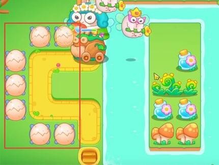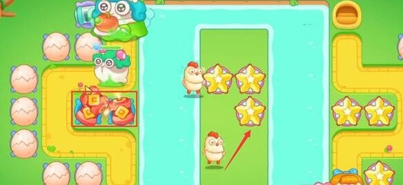 1、在如图所示位置放置一个大鸡蛋,并将大鸡蛋升至满级,并在箭头位置处放置另一个大鸡蛋,增加我们清理障碍的速度