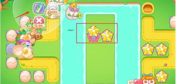 3、将箭头所示处放置一个星星塔并升至满级,星星塔可对后面出现的飞行兔子造成有效的输出。