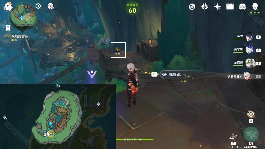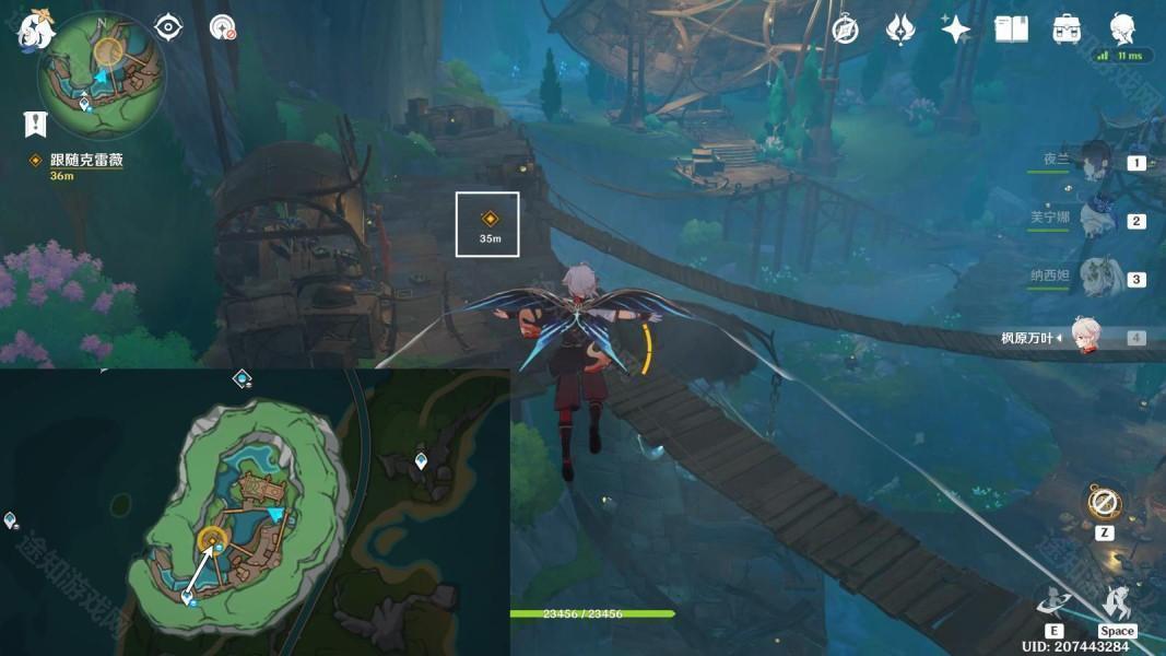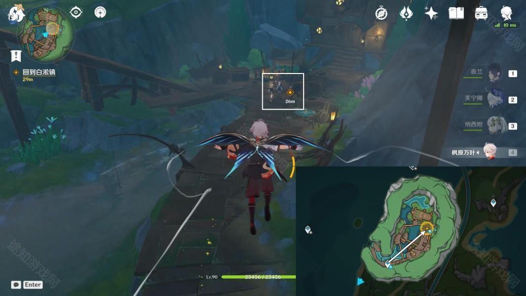 3、跟随克雷薇传送白淞镇锚点,往地图的东北方向飞,前往上层平台。