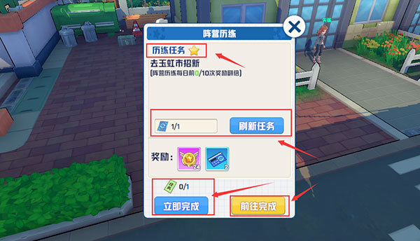 历练任务是有星级区分的,星级越高的奖励越好,如果对现在星级不满意的训练家可以使用刷新券来刷新任务星级。当然也可以用任务券来一键完成任务,而且这个任务券是与治安任务相同的,点击前往可以直接引导训练家去完成任务。