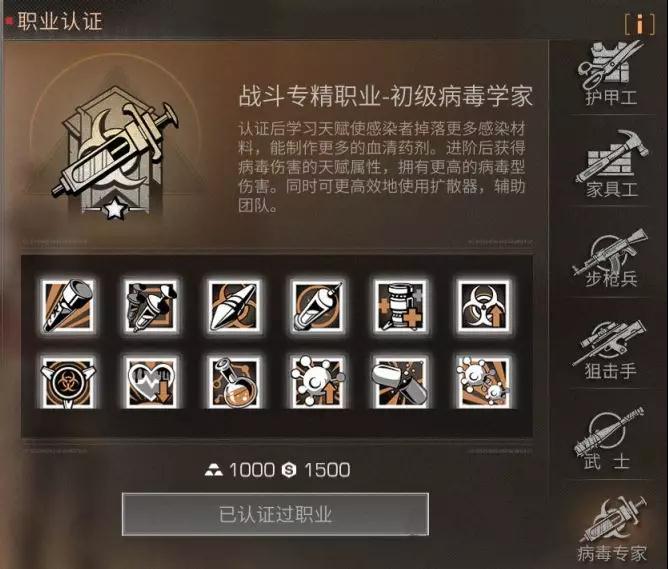 由于病毒学家需要大量制作血清,因此,在初级职业阶段学习采样,病毒学家即可在野外获得更多的相关战利品。