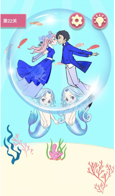 1、玩家先用贝壳划断水草解救右边的美人鱼,