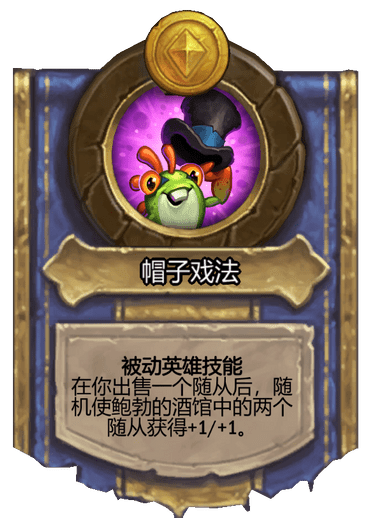 被动英雄技能 在你出售一个随从后,随机使鲍勃的酒馆中的两个随从获得+1/+1。