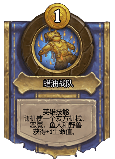 英雄技能 随机使一个友方机械,恶魔,鱼人和野兽获得+1生命值。