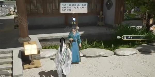 2、接在着府邸门口找到一位茶客,上前进行交谈。