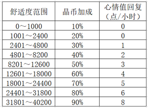 在舒适度加成界面也多了个心情值回复速度,心情值归零的话,妹子仍然可以在咖啡馆工作,但是不会有额外增益。当妹子们在咖啡馆工作的时候,每小时固定消耗12点心情值;当妹子们在主卧和次卧休息时,每小时基础回复4点心情值(不算舒适度加成)。每次摸头会固定回复5点心情值,送礼物不会回复心情值。舒适度的心情值加成如下图: