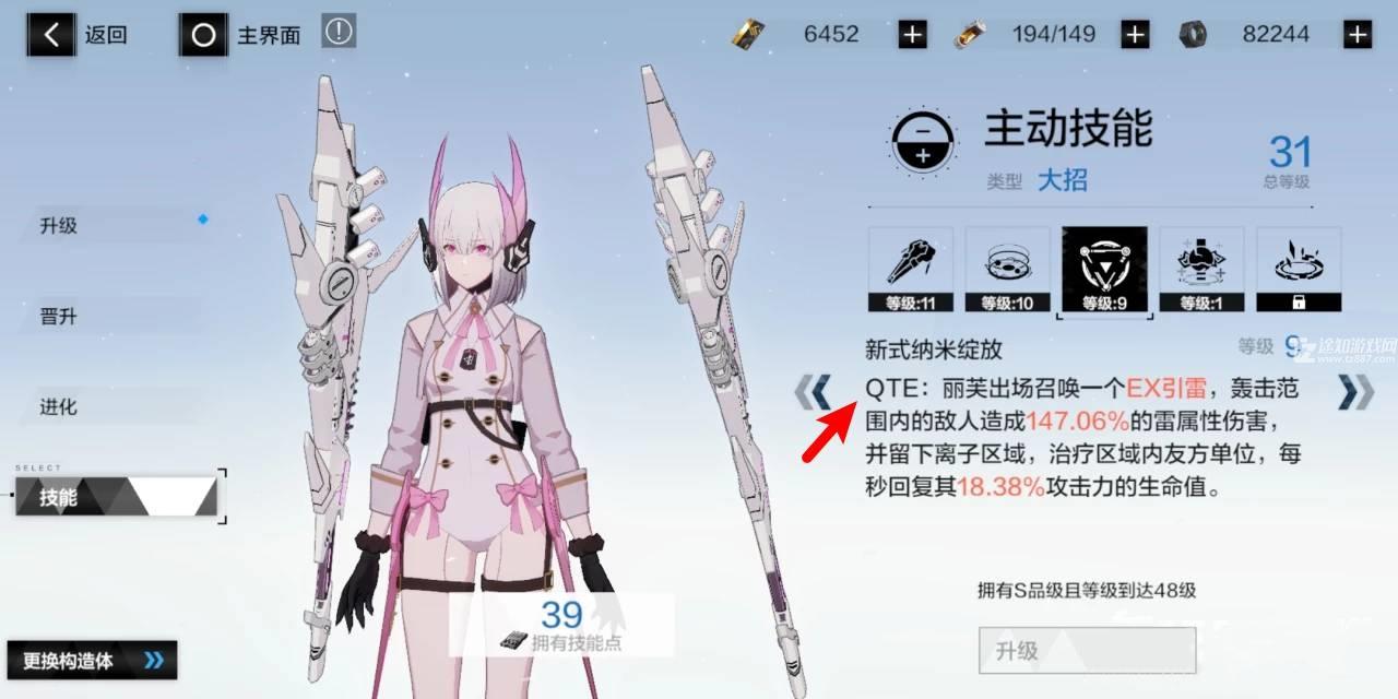 3、qte技能和其他技能一样也是可以升级的,可以通过消耗螺母和技能点数提高等级。