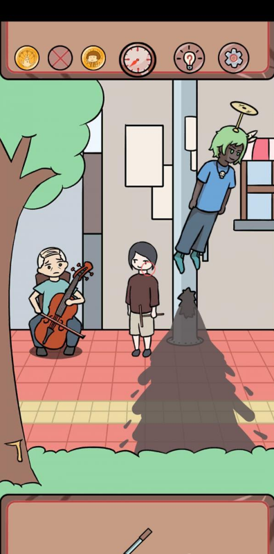 点击获得树枝和草丛里的刀子,然后对树使用刀子获得香松,对大提琴使用,然后点击大提琴,把竹蜻蜓给另一个,点击获得气泡中的竹蜻蜓对主角使用