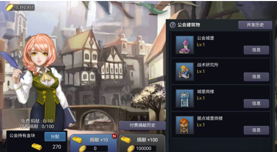 向工会捐献金币,提升工会建筑物,并获得工会buff的系统。