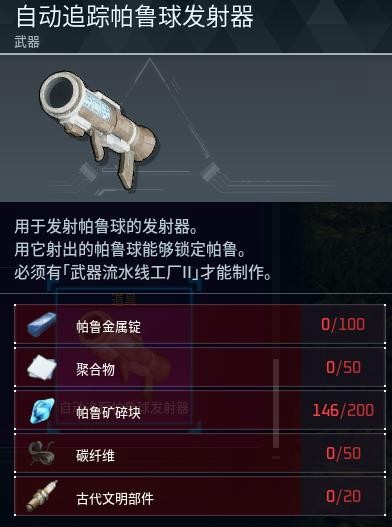 2、需要材料:帕鲁金属锭100、聚合物50、帕鲁矿碎块200、碳纤维50、古代文明部件20。