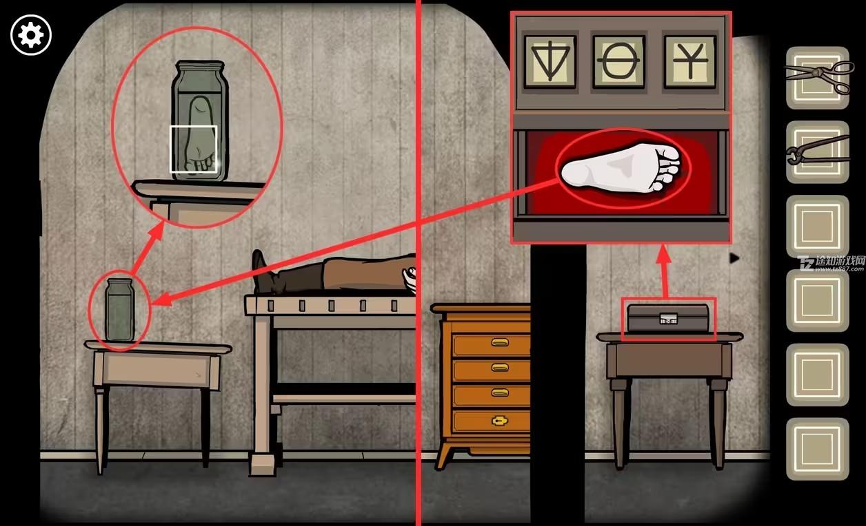 16、回到房间后点击右侧桌子上的盒子,根据黑影形成的符号调整盒子的密码,打开后获得一只(脚)。