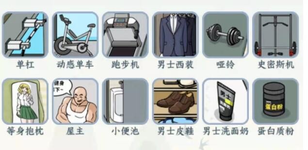 单杠、动感单车、跑步机、男士西装、哑铃、史密斯机、等身抱枕、屋主、小便池、男士皮鞋、男士洗面奶、蛋白质粉