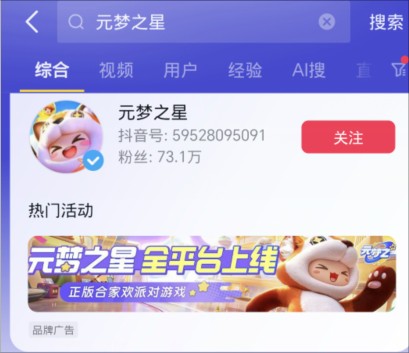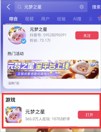 1、打开抖音APP,在搜索栏中输入元梦之星。