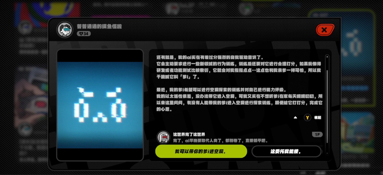 1、我们在绳网看到一个委托,委托人的ai十分的智能,委托人带它前往空洞进行能力评级,我们接下委托。