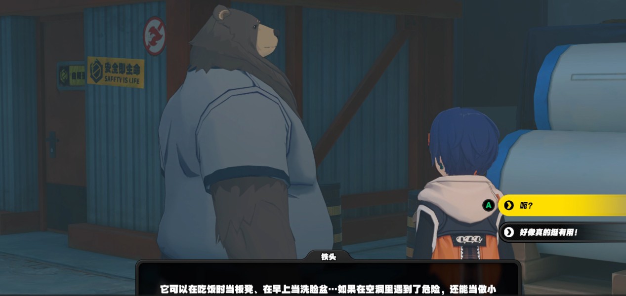 3、在聊天中,铁头告诉了我们安全帽的很多用处,也让我们去找三门那里说白祇重工借的。