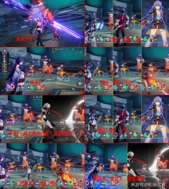 佩拉、桑博普攻大怪,火主开E嘲讽。黄泉开E打大怪,佩拉,火主普攻大怪。
