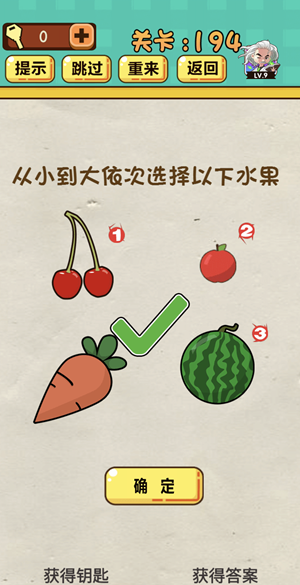 神脑洞游戏第194关的问题是:从小到大依次选择以下水果?其实这是道生活常识题,大家选对了吗?下面赶快来看下正确答案,以及相对应的答案解析吧。