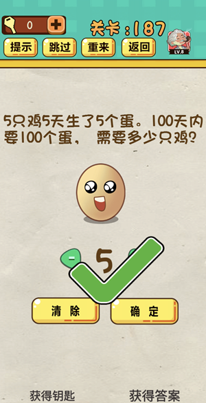 神脑洞游戏第187关的问题是:5只鸡5天生了5个蛋。100天内要100个蛋,需要多少只鸡?这是一道数学题,大家有算出答案吗?下面赶快来看下正确答案,以及相对应的答案解析吧。