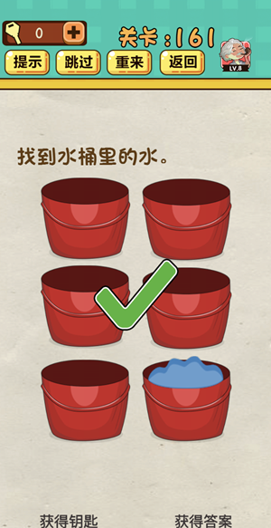 神脑洞游戏161关放着6个桶,要求玩家找到里面的水,那么水究竟在哪个桶里面呢?第161关的问题是:找到水桶里的水?赶快来看下正确答案,以及相对应的答案解析吧。