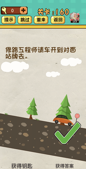 神脑洞游戏160关要求玩家把车开到对面去,很多人束手无策。第160关的问题是:修路工程师请车开到对面站牌去?赶快来看下正确答案,以及相对应的答案解析吧。