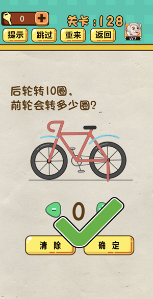 神脑洞游戏每个关卡的问题,都为玩家带来了一场激情燃烧的头脑风暴。第128关的问题是:后轮转10圈,前轮会转多少圈?赶快来看下正确答案,以及相对应的答案解析吧。