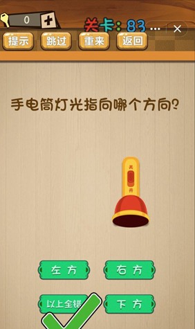 相信很多玩家都可以判断出手电筒的灯光方向,但是神脑洞之中的第83关却让他们有些疑惑,不知道到底指向哪里,下面就来讲解一下答案。