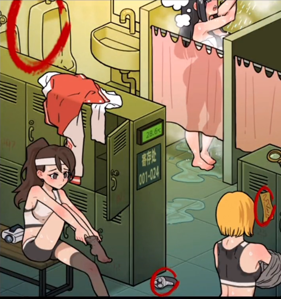 地上的剃须刀、女士浴室的男士便池、还有最左边柜子上的封印等。