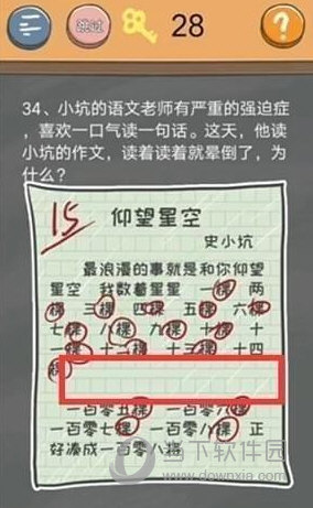 问题:小坑的语文老师有严重的强迫症,喜欢一口气读一句话。这天,他读小坑的作文,读着读着就晕倒了,为什么?