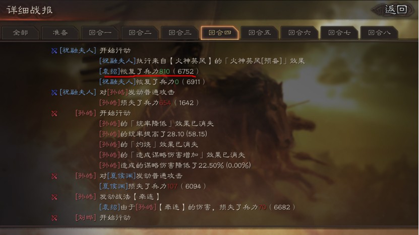 法正自带抵御战法【以逸待劳】,当你的队伍中有祝融夫人时,可以无视该效果,所以祝融夫人是十分克制蜀智队的。战法在第三回合,免疫虚弱,虚弱大家应该十分清楚,中了虚弱以后,输出直接变为0,是最恐怖的DEBUFF之一,而祝融夫人可使2人免疫虚弱,虽只有1回合,但聊胜于无,在面对刘备时,可能会有奇效,再者最为重要的,第三回合开始,每回合行动前会治疗我军群体2人,治疗率158%且受武力影响,治疗率158%大概是个什么概念呢,比如大家熟知的刘备,满级治疗率只有68%,且受智力影响158%的治疗率是刘备的68%的2倍还有余,且刘备1.67的智力成长远低于祝融夫人2.31的武力成长,可见这个3回合的奶是多么的强力,我们来看下相关战报。