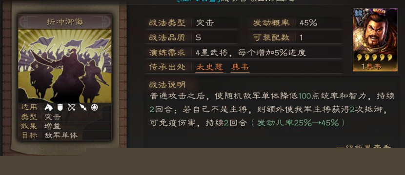武将属性:3星,武力优秀,统率、智力偏低,速度一般;