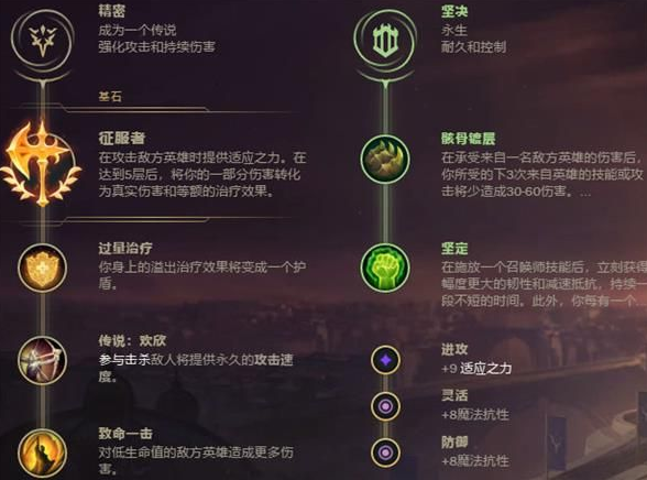 对于盖伦来说精密系的符文能比较好的打出输出的效果,尤其是征服者能配合盖伦的无限E更容易的打出输出的伤害,致命一击配合盖伦的R收割能力非常强悍,坚决加对抗性。