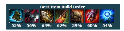 第一件装备推荐黑切增加穿甲属性和移速,顺风的话可以将黑切改成三相,第二件推荐无尽之刃,大幅提高伤害能力,第三件装备推荐死亡之舞,增加吸血与减伤,最后通血手和板甲提高坦度,增加保命能力。