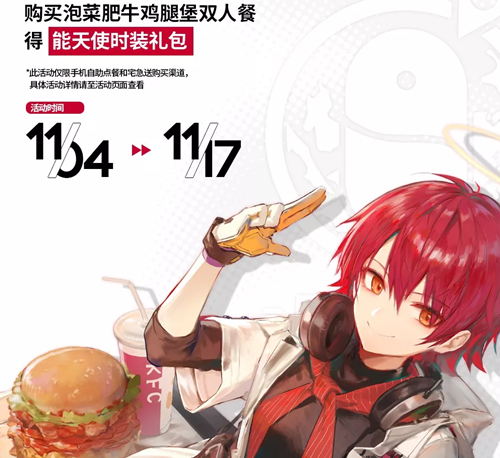 通过手机自助点餐或宅急送订餐购买泡菜肥牛鸡腿堡双人餐 ,即可获得“《明日方舟》能天使 KFC合作时装”电子礼包兑换码一份(唯一渠道发放),电子礼包兑换码将于订单完成后的48小时内自动存入用户肯德基APP的“我的卡包”。活动期间,每个WOW会员账号仅限领取一份礼包。(如遇泡菜肥牛鸡腿堡双人餐售罄,可通过购买热辣双人套餐参与活动。)