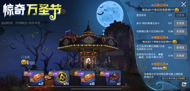 每天保底获得7个“南瓜币”的方法,就是通过日常任务进入游戏、参与1局经典模式战斗、经典模式累计存活20分钟;神秘任务在万圣排队雾天跳舞1次或乘坐旋转木马1次、打败南瓜头、蝙蝠、幽灵、玩具手臂。其中日常任务可获得3个免费南瓜币,神秘任务可获得4个免费南瓜币。