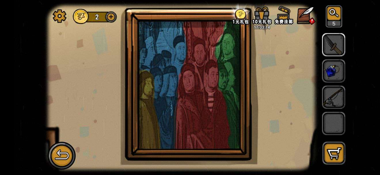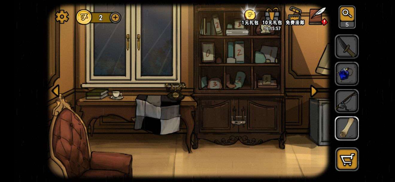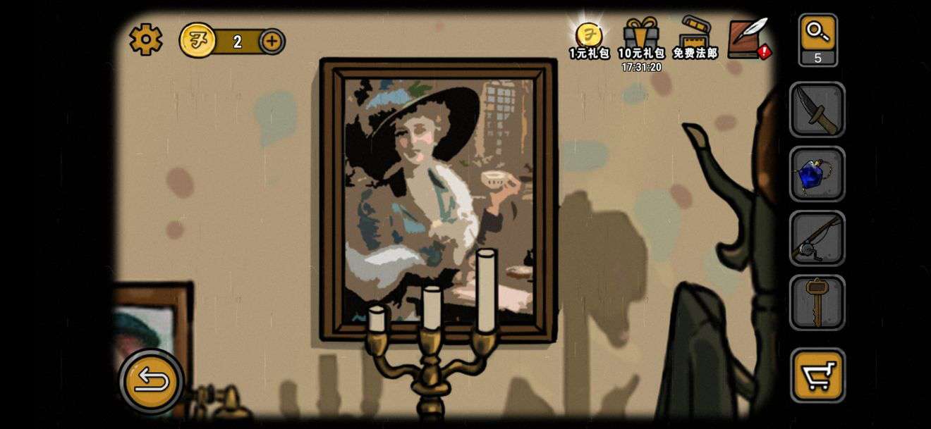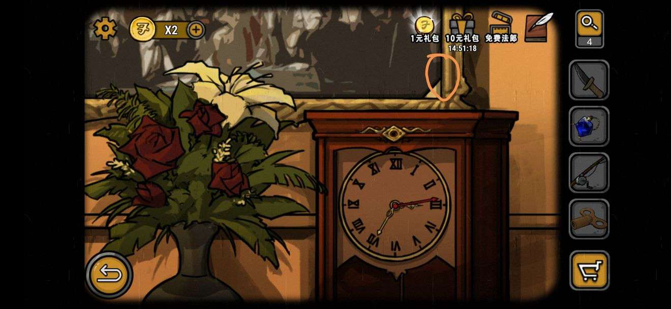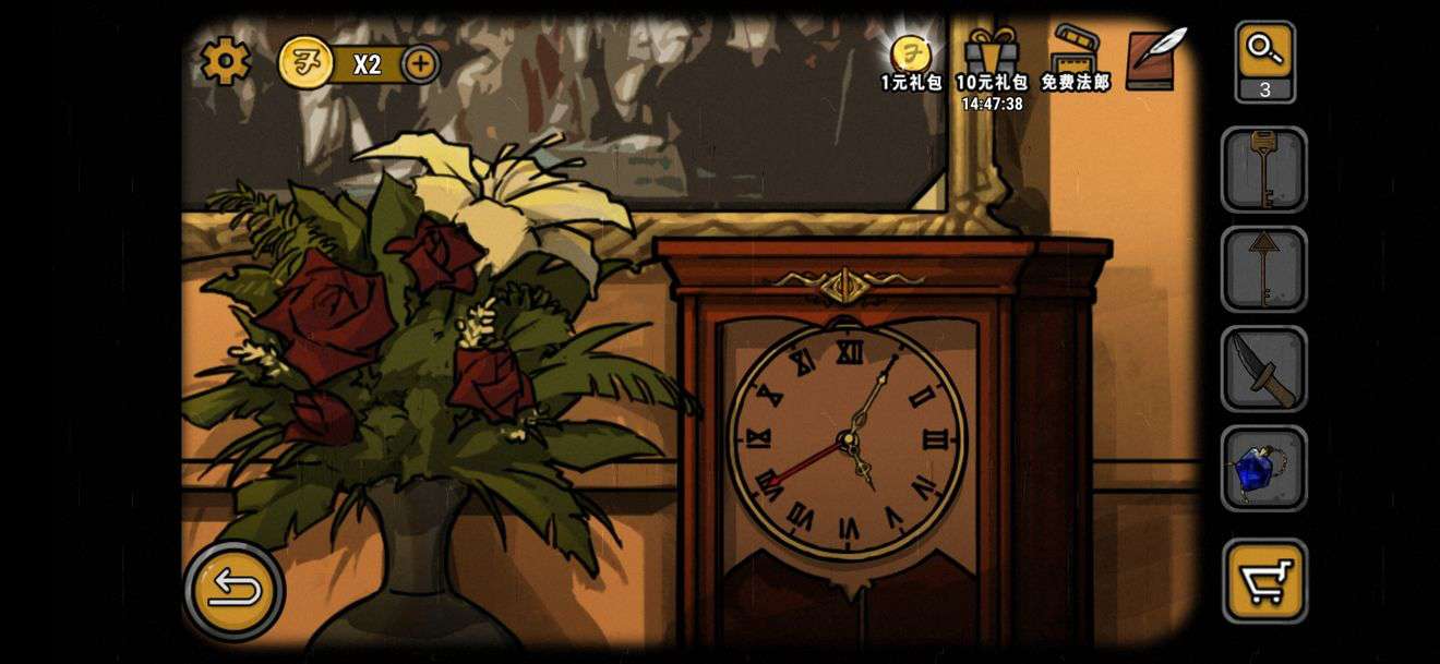 在花瓶上方的画框右下角(图中画圈位置,我已经拿了),找到分针,安上后点击听到钟声响起(咚咔咚咔咚咚咚咔咚咔咚咔咚咚,咚为数,咔为断),对应左下蓝色桌布的箱子密码113112,得到发条