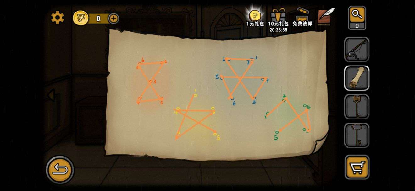 在靠门口的花瓶里拿到密码图,按数字顺序链接后数三角形数量,得出密码2431,打开旁边书架右上角的盒子