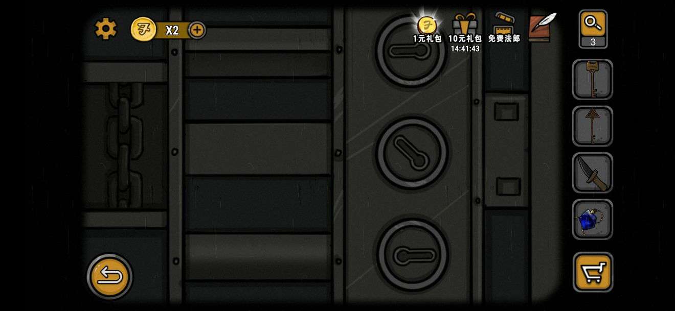 来到边上的牢房,按锁左边锁条的形状,得知从上到下插钥匙的顺序是三角形、方形和圆形,再扭对锁眼位置(三把都插进去了才能扭)