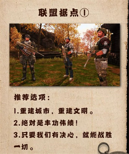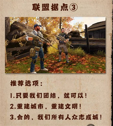 联合三大势力,幸存者们需要前往秋日森林、沙石堡的各个据点,通过对话选择,帮助各大势力的成员提升士气。