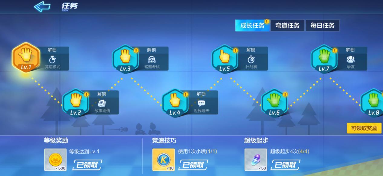 而在跑跑卡丁车手游里面的成长任务,除了我们到达了相应的等级后能领取相应的奖励外,还能够完成在这个等级里其它两个成长任务,也就是说在跑跑卡丁车手游里完成成长任务比在一些竞品赛车手游里完成成长任务所获得的奖励多得多。