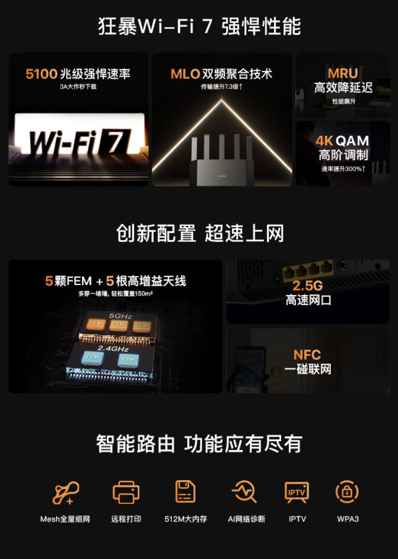 据介绍,这款路由器配备 5 颗 FEM 及 5 根高增益天线,其支持 MLO 双频聚合技术及 Mesh 全屋组网技术,内置 512MB RAM,支持 NFC 一碰联网、远程打印功能。