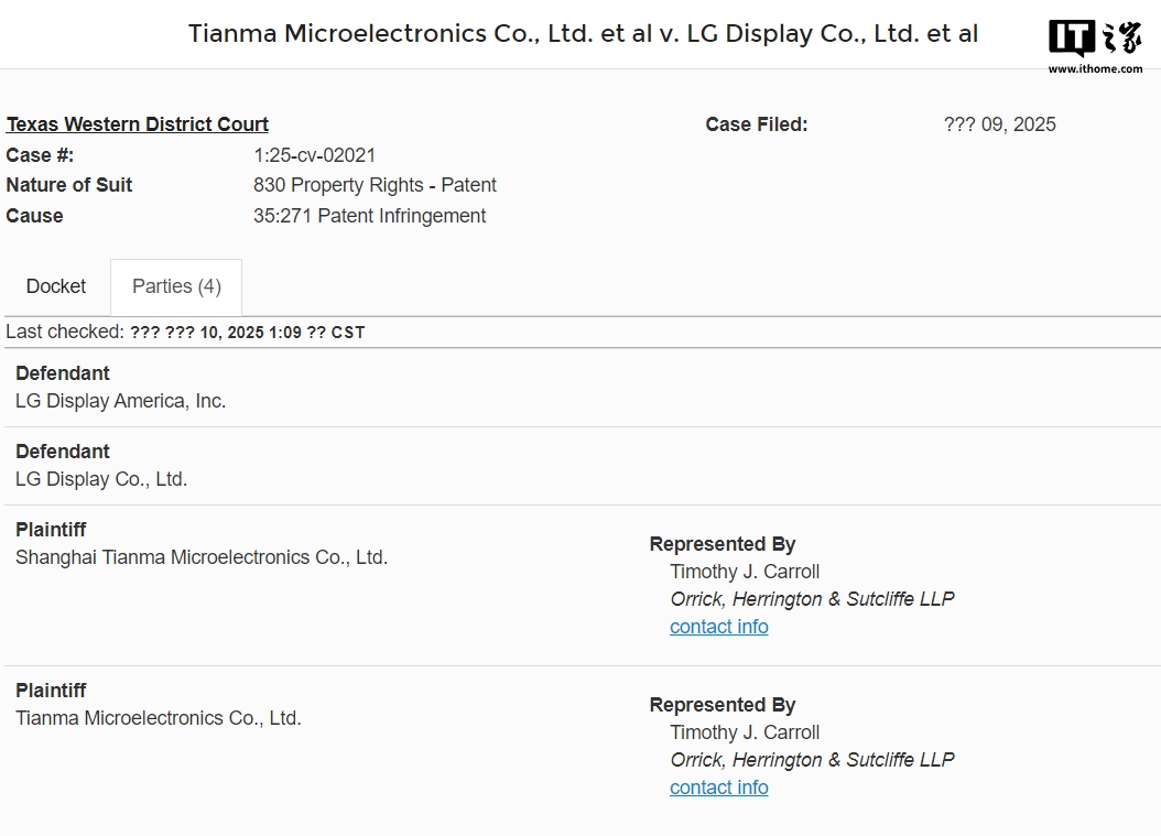 当地时间 12 月 9 日,天马微电子股份有限公司与上海天马微电子股份有限公司就 LG Display 的专利侵权问题对簿公堂。原告向得克萨斯州西区联邦地区法院奥斯汀分院提起诉讼,控告 LG Display 及其美国子公司 LG Display America,要求赔偿四项专利侵权损失。